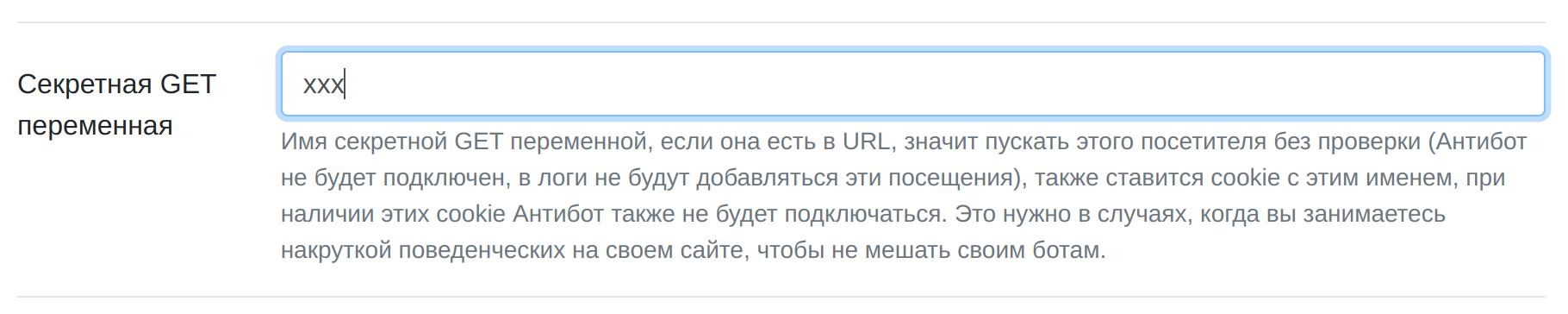 Для пропуска своих ботов без проверки - нужно в конфиге скрипта Антибот заполнить поле Секретная GET переменная (Secret allow get). Это название секретной GET переменной для URL (а также название секретной COOKIE), при наличии которых не будет подключаться Антибот проверка (Антибот не будет проводить проверку, в логи и счетчики не будут добавляться эти посещения). При обращении к URL с этой гет переменной будет ставиться COOKIE с этим названием, чтобы последующие обращения к любым урлам уже были без Антибот проверки.