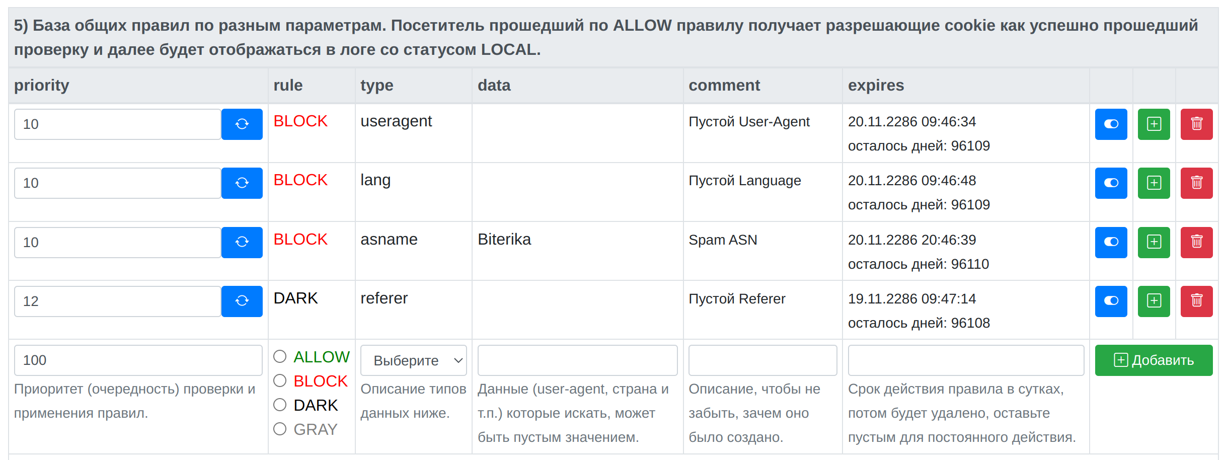 BLOCK правила лучше размещать выше других правил. Если появятся новые правила, которые полезно добавить - вы сможете это узнать в разделе "Чек Лист" в админке скрипта Антибот на вашем сайте.