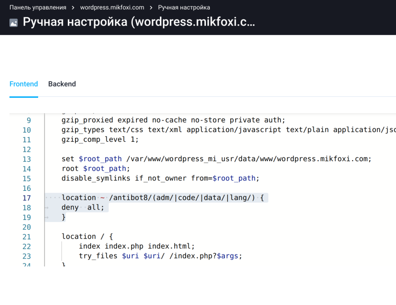 В панели управления ISPmanager если сайт работает как Nginx + PHP-fpm, это редактируется в конфиге домена в Nginx в разделе: Сайты - Отметить нужный сайт - Файлы конфигурации. И там в двух местах вставить этот код. Почему в двух местах? - Потому что там две секции server {} для http и https. И потом перезагрузить Nginx в разделе: Мониторинг и журналы - Службы.