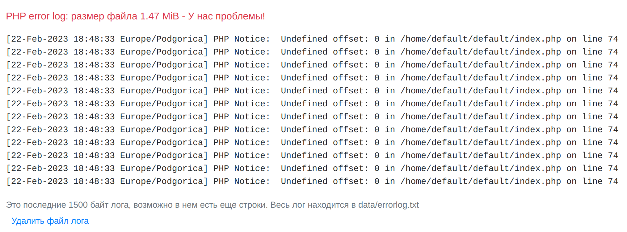 Если включена запись в лог, то все ошибки PHP скриптов сайта (как связанные со скриптом Антибот, так и не связанные) будут записывать в файл data/errorlog.txt и отображаться на главной странице админки. Пример: